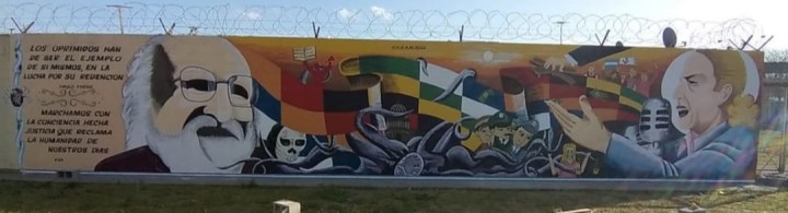 Los ganadores del mural ganador "Educación Popular y Justicia Social Vs. Poder Real", explicaron su obra: “El mural contiene a la izquierda la imagen de Paulo Freire que representa la Educación Popular, el pensamiento, la conciencia crítica, a la derecha la imagen de Eva Perón que representa La Justicia Social, la mujer, la lucha feminista y la lucha del pueblo, las imágenes están entrelazadas con una Bandera Wiphala que represente la diversidad cultural, sexual y de pensamiento, todo esto en lucha contra una figura de un pulpo que en cada tentáculo tiene figuras como la muerte, los medios de comunicación, la justicia con los ojos y boca tapados por dinero, la junta militar de la dictadura, el parlamento, todo manejado por un brazo que no se sabe bien de quien es , como una marioneta que se rige por el dinero que representa el poder real. El mensaje que se quiere dar es que la lucha contra este poder real que es el predominante en esta sociedad que vivimos son la educación popular que nos marca un camino hacia una conciencia crítica, la justicia social y la lucha del pueblo por ampliar derechos por defender la democracia, por crear conciencia social”.