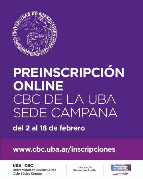 La Secretaría de Inclusión, Educación y Cultura del Municipio informó las fechas de inscripción para el Ciclo Básico Común (CBC) de la Universidad de Buenos Aires (UBA) que se dicta en Campana.