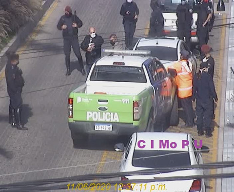 Minutos después, los monitoristas constataron que el rodado se encontraba sobre la mencionada avenida, frente al Banco Santander Río, con un ocupante al volante mientras que el otro individuo iba y venía hablando con distintas personas. Luego, se observó que el conductor descendió sin ningún tipo de protección ante la emergencia sanitaria ni respetó el distanciamiento social.