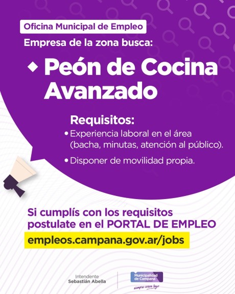 En esta oportunidad, se solicita guardia de seguridad, personal de maestranza, peón de cocina avanzada, bar tender, cocinero parrillero y tutor de aprendizaje. Las postulaciones deben realizarse a través del Portal de Empleo del Municipio.